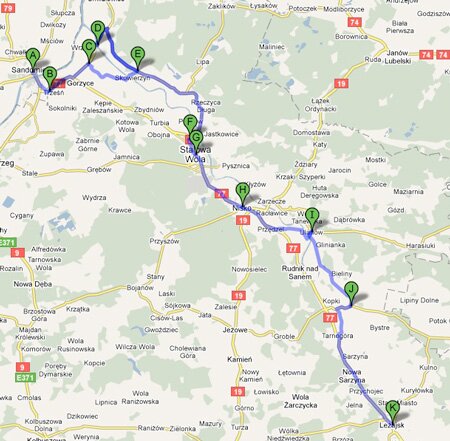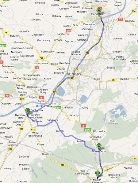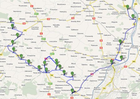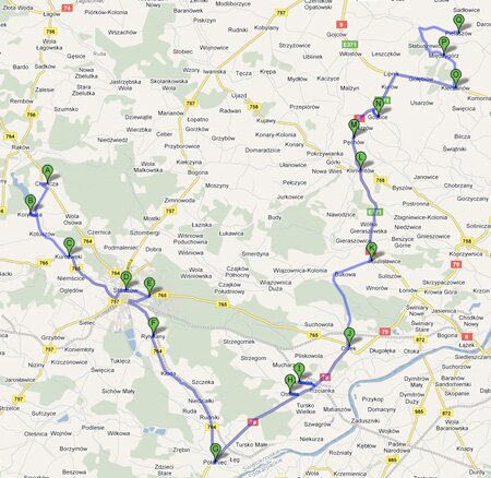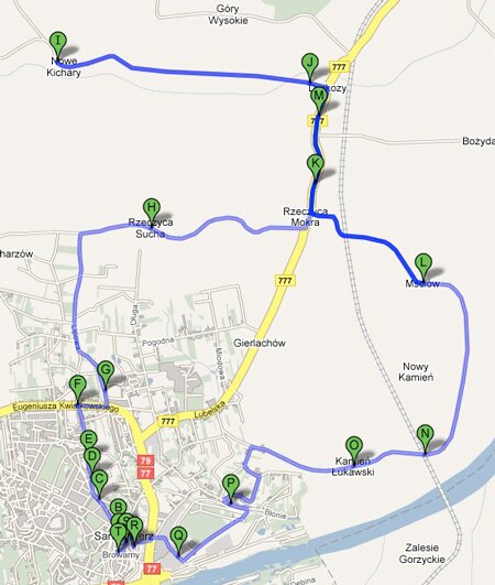 Sandomierz - Rynek, ul.Mickiewicza (0,3km), ul.Żeromskiego, ul.Sienkiewicza, ul.Okrzei, ul.Energetyczna, ul.Kwiatkowskiego (2,55km), ul.Milberta, Rzeczyca Sucha (5,50km) Kichary Nowe, skrzyżowanie polnych dróg - Kapliczka z XVIIw. (6,50km), ruiny baszty dawnego folwarku p.p. Benedyktynek z XVIIw. (7,60km), most na rzece Opatówce, Kichary Nowe z kapliczką po środku (8,04km), doliną Opatówki do Dwikóz, Doraz-Mściów (15,1km),Kamień Nowy (17,9km), Stacja PKP Metan (18,4km), Kamień Łukawski (19,5km) z tego miejsca możemy podjechać na najwyższe wzniesienie w Górach Pieprzowych - 201m n.p.m. urzekające widoki, z Kamienia Łukawskiego wąwozem do ul.Błonie ul.Przemysłowa (22,3km), ul.Browarna (22,9km), ul.Sokolnickiego, Sandomierz Rynek (23,5km).